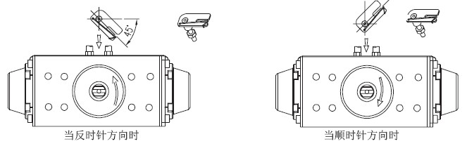 3,把執(zhí)行機(jī)構(gòu)軸的回轉(zhuǎn)位置對(duì)準(zhǔn)起始位置,即開(kāi)度的0%位置。當(dāng)執(zhí)行機(jī)構(gòu)是利用彈簧的單作用氣缸時(shí),如果不輸入氣源壓力,則氣缸軸始終返回到起始點(diǎn),因此很容易確認(rèn)。當(dāng)雙作用氣缸時(shí),請(qǐng)參照氣缸說(shuō)明書(shū),確認(rèn)是順時(shí)針旋轉(zhuǎn)還是逆時(shí)針旋轉(zhuǎn),或輸入空壓時(shí)氣缸軸的回轉(zhuǎn)方向來(lái)判斷。